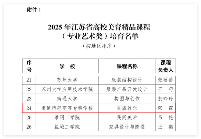 近日,江苏省教育厅公布了2025年高校美育精品课程(专业艺术类)培育名单,我校音乐舞蹈学院倾力打造的《民族器乐》课程成功入选。此次评选面向全省高校展开,本专科教师同台竞技,竞争激烈。全省仅30门课程获此殊荣,我校课程的入选既是我校美育教学成果的重要突破,也是对我校在中华优秀传统文化传承创新教育领域深耕细作的充分肯定。